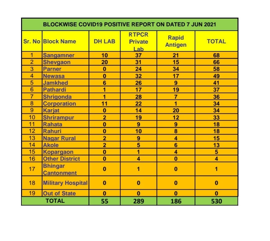 अहमदनगर 7 जून 2021 : दिलासादायक ! चांगली बातमी !! कोरोनाची दुसरी लहर ओसरत आहे. आज अहमदनगर महानगर पालिका हद्दीत रुग्ण संख्येत 34 ने वाढ झाली. जिल्ह्याच्या एकूण रुग्ण संख्या यादीत आज शहर 8 व्या क्रमांकावर. अहमदनगर महानगरपालिका हद्दित कोरोना रुग्ण संख्येत आज 34 ने वाढ झाली तसेच अहमदनगर जिल्ह्यातील रूग्णसंख्येत आज 530 ने वाढ झाली सध्या आपले अहमदनगर संपूर्ण अनलॉक झाले आहे लवकरच आपण या महामारीतून मुक्त होउ हीच अपेक्षा करूया तो पर्यंत नियमांचे पालन करा आणि लसीकरण करून घ्या.