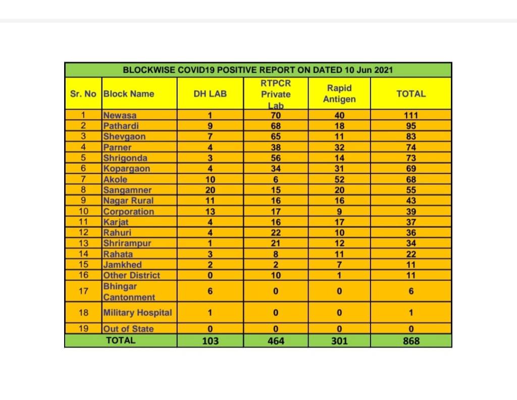 अहमदनगर 10 जून 2021 : आज अहमदनगर महानगर पालिका हद्दीत रुग्ण संख्येत 39 ने वाढ झाली. जिल्ह्याच्या एकूण रुग्ण संख्या यादीत आज शहर 10 व्या क्रमांकावर. अहमदनगर महानगरपालिका हद्दित कोरोना रुग्ण संख्येत आज 39 ने वाढ झाली तसेच अहमदनगर जिल्ह्यातील रूग्णसंख्येत आज 868 ने वाढ झाली सध्या आपले अहमदनगर संपूर्ण अनलॉक झाले आहे लवकरच आपण या महामारीतून मुक्त होउ हीच अपेक्षा करूया तो पर्यंत नियमांचे पालन करा आणि लसीकरण करून घ्या.
