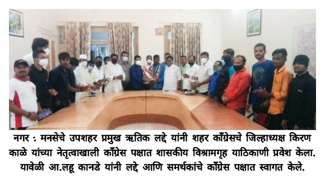 जिल्हा शासकीय विश्रामगृह येथे नुकताच हा प्रवेश पार पडला. ऋतिक लद्दे हे सावेडी उपनगरातील युवा नेतृत्व असून ते मनसेचे उपशहर प्रमुख होते. त्यांनी आपल्या पदाचा राजीनामा देत काँग्रेसचा झेंडा आपल्या खांद्यावर घेतला आहे. यावेळी ऋतिक लद्दे यांच्यासह अक्षय बरकासे, सौरव सोनार, शुभम आव्हाड, नईमुदिन शेख, वैभव तिजारे, आनंद शिंदे, किरण नेटके, सुयोग अडगल, अनाता पालवे, समीर अत्तार, अविनाश जाधव, सोहेल शेख, विजू थोंबे, सौरभ कांबळे, शफीक शेख, धनंजय गायकवाड आदींसह युवकांनी मोठ्या संख्येने काँग्रेसमध्ये प्रवेश केला.