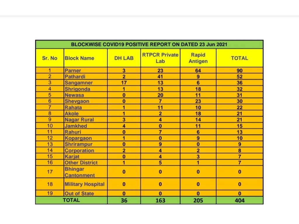 दरम्यान, आज डिस्चार्ज मिळालेल्या रुग्णामध्येअकोले १९, जामखेड ०९, कर्जत २४, कोपरगाव ११, नगर ग्रा. ०३, नेवासा १३, पारनेर ४४, पाथर्डी ६०, राहता ३४, राहुरी ३७, संगमनेर ४८, शेवगाव १३, श्रीगोंदा २७, श्रीरामपूर ३३ आणि इतर जिल्हा ०१ अशा रुग्णांचा समावेश आहे.