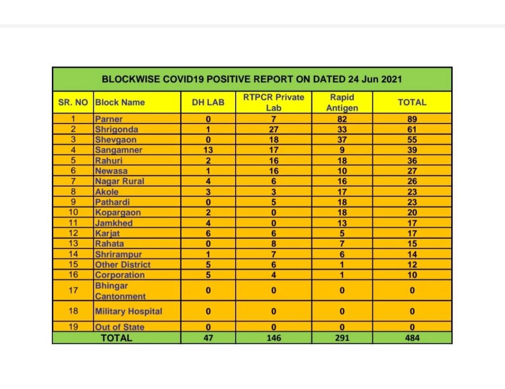 अहमदनगर दि 24 जून 2021 आज अहमदनगर मनपा हद्दीत रुग्णसंख्येत 10 ने वाढ आणि अहमदनगर जिल्ह्यातील एकूण रुग्णसंख्येत आज 484 ने वाढ .