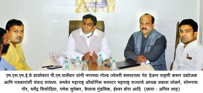 येथील कामकाजाची पाहणी केलेल्यानंतर याच धर्तीवर सुमारे 20 करोड रुपये खर्चुन कौन्सिल ज्वेलर्स करिता एक सामुहिक केंद्र नागपुरला उभारले जात असून, सध्याच्या कोरोनाच्या प्रादुर्भावानंतर एमएसएमई अंतर्गत लघु उद्योजकांकरिता भरपुर संधी उपलब्ध झाल्या असून, अशा परिस्थितीत उद्योजकांनी पुढाकार घ्यावा व या मंत्रालयाच्यावतीने कार्यान्वित केलेल्या योजनाचा आपल्या उद्योगाच्या भरभराटीसाठी उपयोग करावा, असे आवाहन पार्लेवार यांनी केले. पी.एम.पार्लेवार यांनी नगरच्या गोल्ड ज्वेलरी क्लस्टरची पाहणी करुन तेथील कामकाजाबद्दल मोठे समाधान व्यक्त केले. पत्रकार परिषदेनंतर या ठिकाणी सुरु असलेल्या कामकाजाची पाहणी केली.