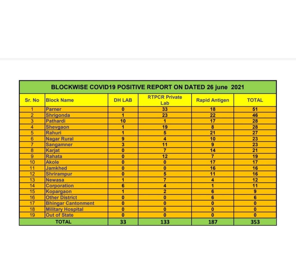 जिल्हा रुग्णालयाच्या कोरोना टेस्ट लॅब मध्ये बाधीत आढळून आलेल्या रुग्णामध्ये मनपा ०६, कोपरगाव ०१, नगर ग्रा. ०९, नेवासा ०१, पाथर्डी १०, राहुरी ०१, संगमनेर ०३, शेवगाव ०१ आणि श्रीगोंदा ०१ अशा रुग्णांचा समावेश आहे.