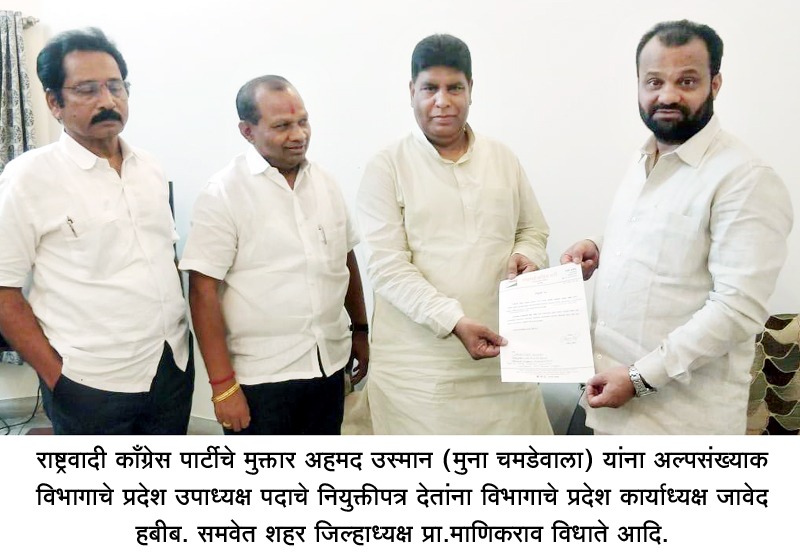 अहमदनगर- राष्ट्रवादी काँग्रेस पक्षाच्या अल्पसंख्याक विभागाच्या प्रदेश उपाध्यक्षपदी मुक्तार अहमद उस्मान (मुन्ना चमडेवाला) यांची नियुक्ती प्रदेशाध्यक्ष ना.जयंतराव पाटील यांच्या मान्यतेने करण्यात आली. उत्तर महाराष्ट्राच्या दौर्यावर असलेले या विभागाचे प्रदेश कार्याध्यक्ष जावेद हबीब नगर शहरात आले असता, त्यांनी पक्षाच्या अल्पसंख्यांक विभागाची आढावा बैठक घेतली. त्यानंतर हे नियुक्ती पत्र दिले.