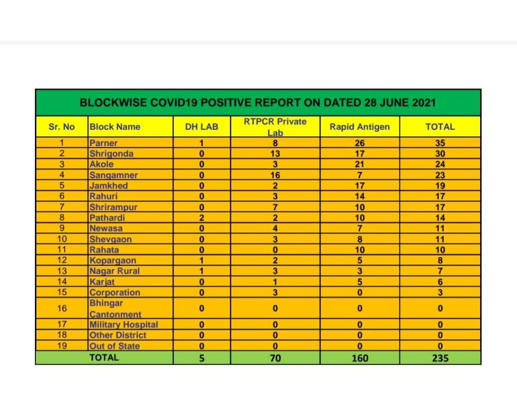 जिल्हा रुग्णालयाच्या कोरोना टेस्ट लॅब मध्ये बाधीत आढळून आलेल्या रुग्णामध्ये कोपरगाव ०१, नगर ग्रा. ०१, पारनेर ०१ आणि पाथर्डी ०२ अशा रुग्णांचा समावेश आहे.