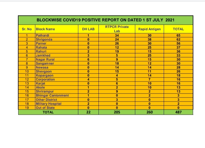 जिल्हा रुग्णालयाच्या कोरोना टेस्ट लॅब मध्ये बाधीत आढळून आलेल्या रुग्णामध्ये मनपा ०४, अकोले ०१, जामखेड ०३, नगर ग्रा. ०६, पाथर्डी ०१, राहुरी ०२, श्रीरामपूर ०२, कॅंटोन्मेंट बोर्ड ०१ आणि मिलिटरी हॉस्पिटल ०२ अशा रुग्णांचा समावेश आहे.