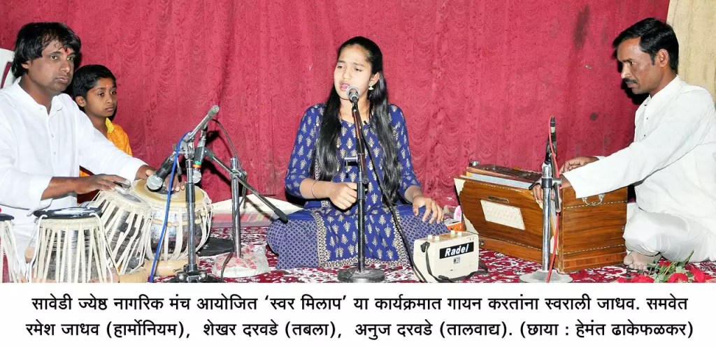 नगर – सावेडी ज्येष्ठ नागरिक मंचच्यावतीने ‘स्वर मिलाप’ या कार्यक्रमाचे आयोजन करण्यात आले होते. याप्रसंगी अध्यक्ष आदिनाथ जोशी, शिवप्रसाद जोशी, शरद कुलकर्णी, पुष्पा चितांबर, एस.एन.कुलकर्णी, बलभीम पांडव, मोरेश्वर मुळे आदि उपस्थित होते.